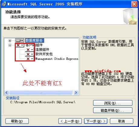 (8)逐个点击组件前的X箭头,选中“将所有的程序功能选择安装到本地硬盘上”,直到所有选项前都没有X图标,然后“下一步”。如下图所示: